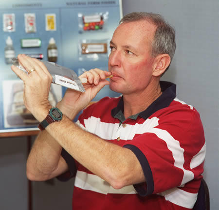 Di luar angkasa,garam dan merica tersedia tapi dalam bentuk cair.Oleh karena itu astronot tidak bisa menaburkan garam dan merica pada makanan mereka di ruang angkasa.Jika garam dan merica dalam bentuk bubuk,mereka akan melayang dan bisa menyebabkan bahaya.Mereka bisa menyumbat ventilasi udara, mencemari peralatan atau terjebak dalam mata, mulut atau hidung astronot.