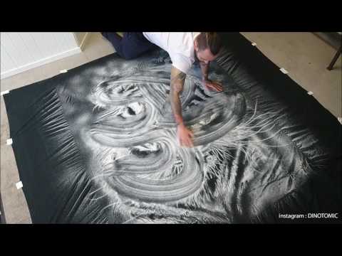 Dia hanya menggunakan kain hitam yang lebar untuk alasnya menggambar. Memang sudah bertahun-tahun Dino Tomic ini membuat karya-karya yang menakjubkan, tapi sayangnya karyanya itu hanya sedikit yang dipajang. Kebanyakan karya-karya yang sudah ia buat hanya ia foto saja dan dimasukan ke Instagram, Youtube, dan Facebook untuk dokumentasi. Selanjutnya karya-karyanya itu di bersihkan lagi. (Mungkin garamnya mau dipakai untuk dia masak kali ya gan)
