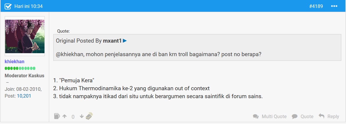 Ane ikut serta dalam suatu perdebatan, dan barusan di ban oleh moderator Khiekan: