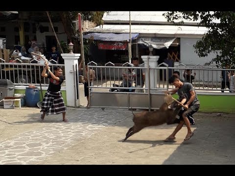 Nampak seorang pemuda berusaha menjinakan babi tersebut di area parkir masjid, naasnya babi itu menyeruduk si pemuda sampai terkapar.