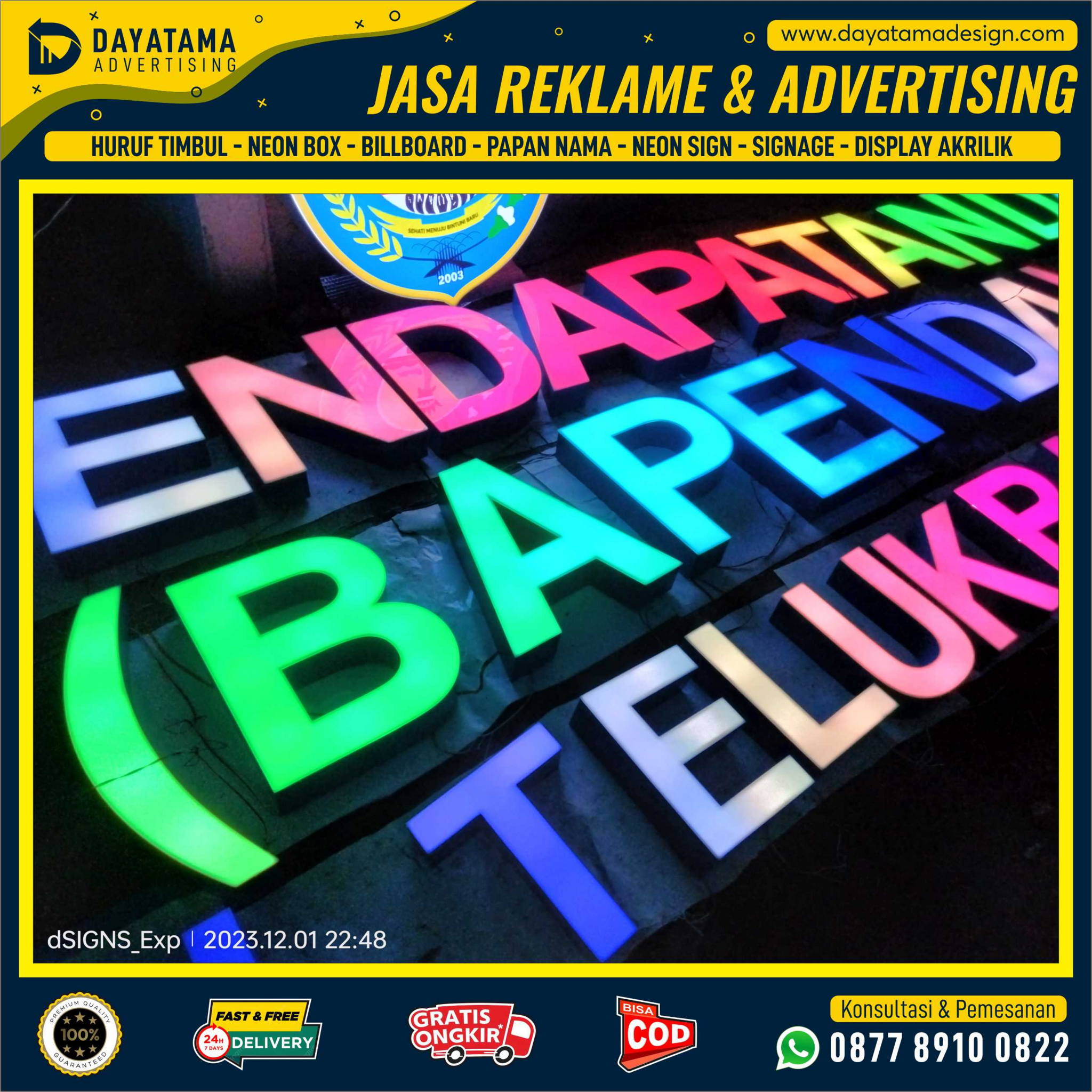 Neon Box | Huruf Timbul | Neon Sign | Papan Nama | Signage | Plang Nama | Akrilik Custom | Laser Akrilik | Cutting Sticker | Sign Board dan masih banyak produk custom lainnya.