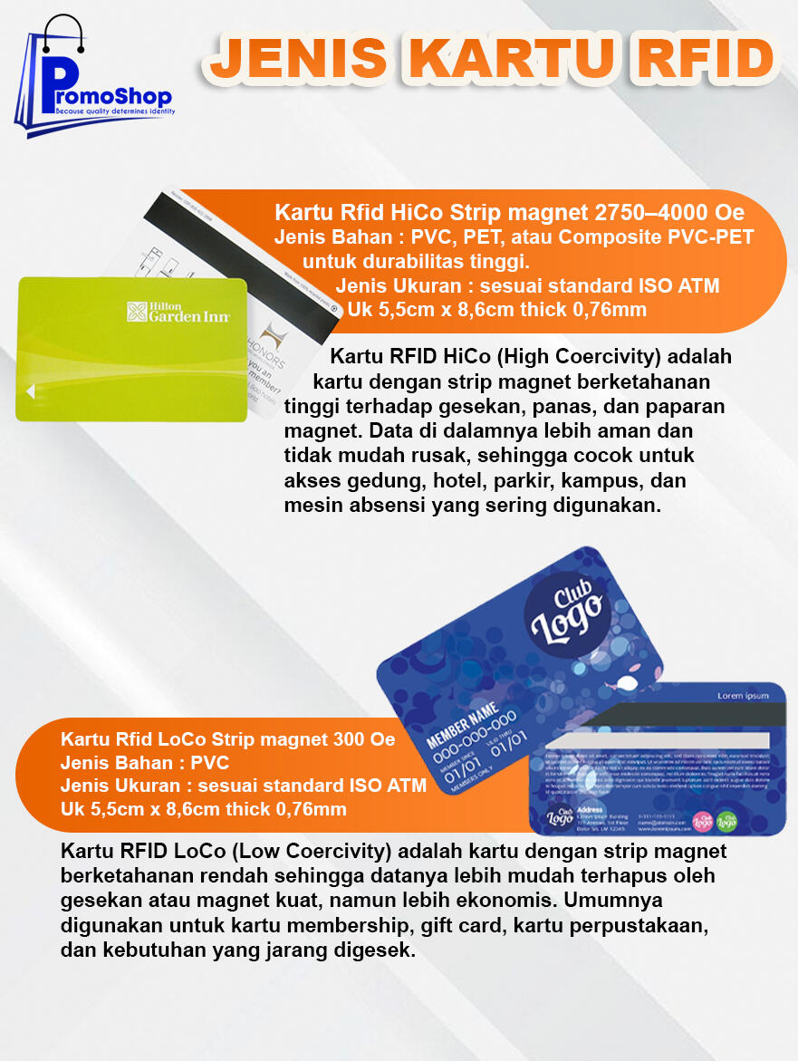 Jenis ukuran Rfid HiCo & LoCo : sesuai standard ISO ATM Uk 5,5cm x 8,6cm thick 0,76mm
