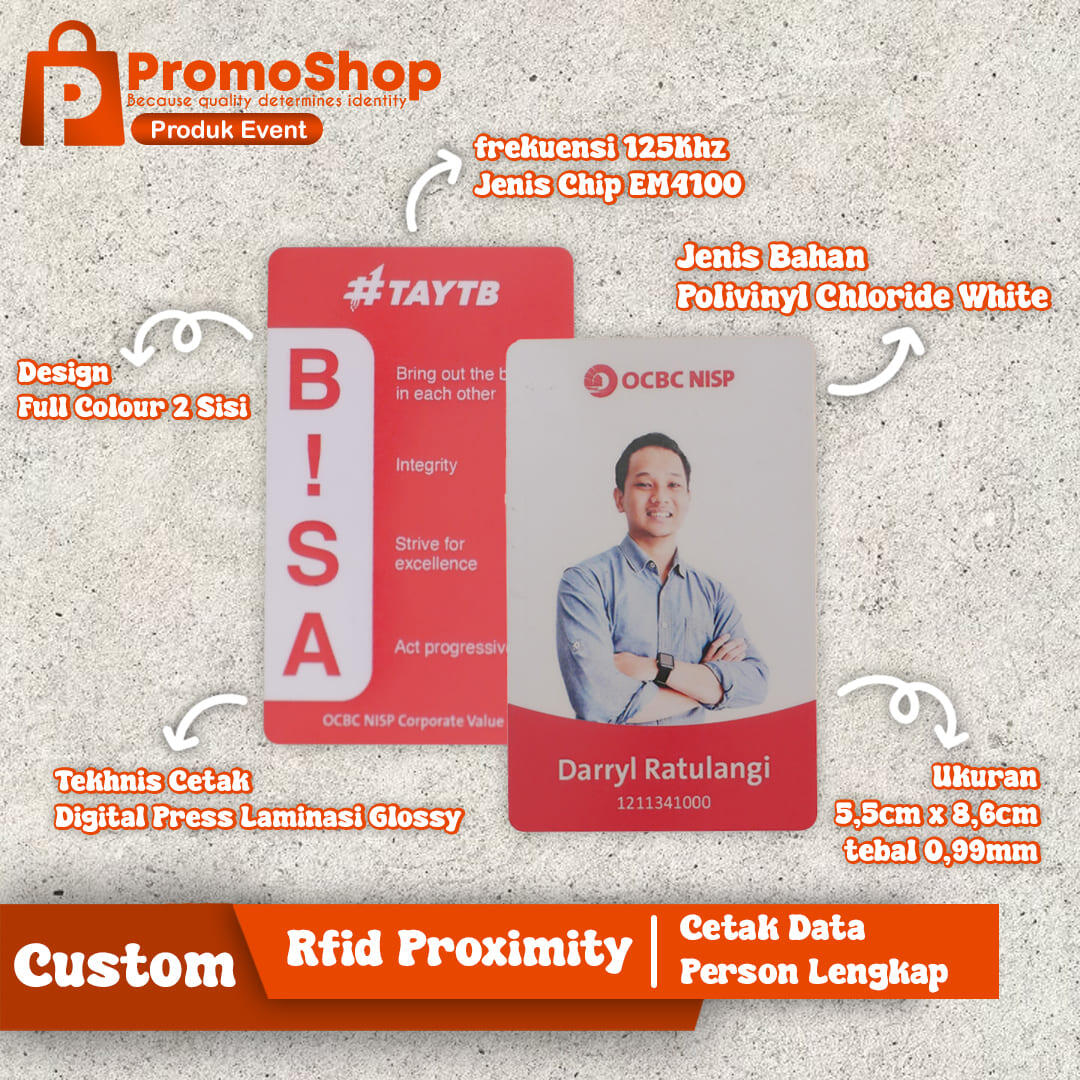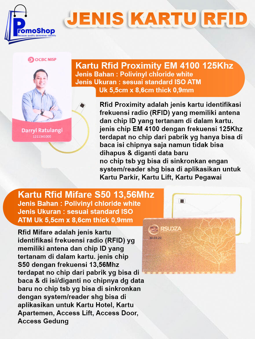 Jenis ukuran Rfid Proximity & Mifare : sesuai standard ISO ATM Uk 5,5cm x 8,6cm thick 0,9mm